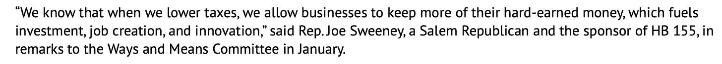 By way of background, the Koch business-tax-cuts began about ten years ago. In 2015, the BPT rate was 8.5%, while the BET rate was 0.75%. By 2023, the BPT rate had been cut to 7.5%, and the BET rate to 0.55%. Last week, the House Ways and Means Committee voted along party lines to cut the BET rate from .55% to .5%.
